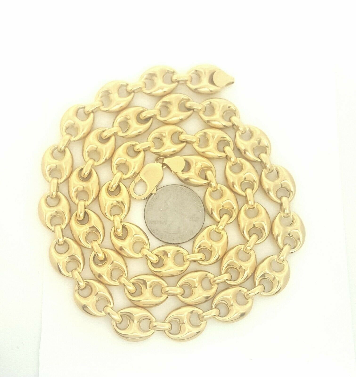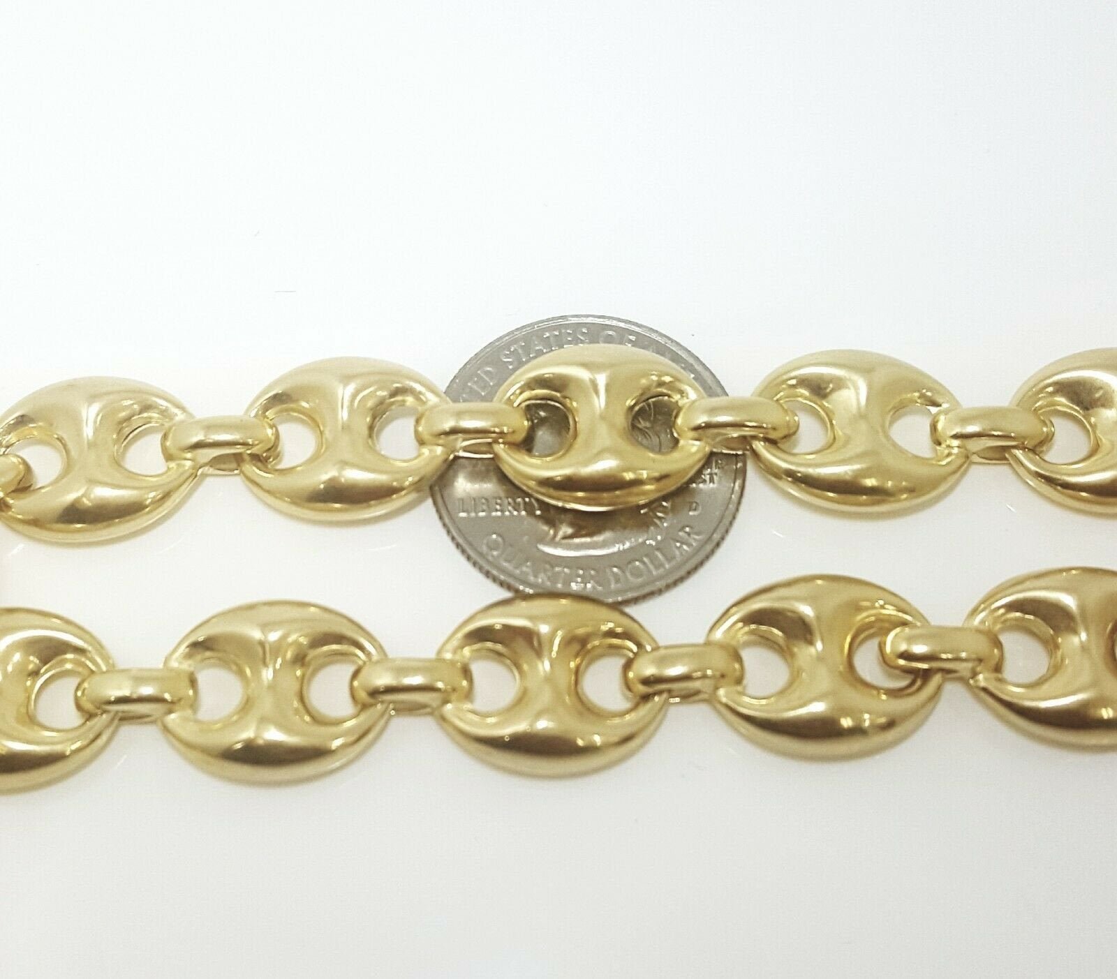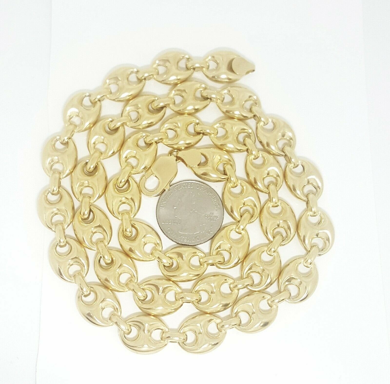Item description: Beautiful New 10K yellow gold 13mm hollow puff Gucci link chain Necklace 46.6 Grams 28" Long. Metal: gold Condition: brand new Style: hollow puff Gucci link Purity: 10k Color: yellow gold Length: 28 inches long Width: 13mm (widest point). Weight: 46.6 grams Other length available please ask for price  Please refer to the photo of the item next to a quarter for comparison purposes. Shipping: Your order will be professionally packed and shipped. US free shipping is for the 48 Continental states. For shipping to Alaska, Hawaii and Puerto Rico please contact us for a quote. We also offer overnight shipping for the cost of $25.00 which the estimated delivery time is one business day. Return Policy:  30 Day Money Back Guarantee We want your online shopping experience to be risk free. With our hassle-free return policy, if you are not completely satisfied with your purchase, simply ship the item back to us in its original, unused condition (including all original packaging and/or tags) within 14 days for a full refund, less shipping costs. Please email us for a return authorization number prior to shipping the item back. Be sure to add me to your favorites list! Check out my other items! Buy with confidence!