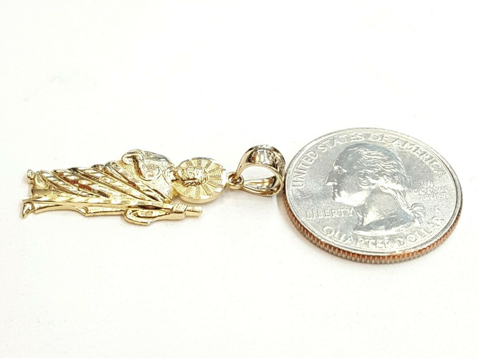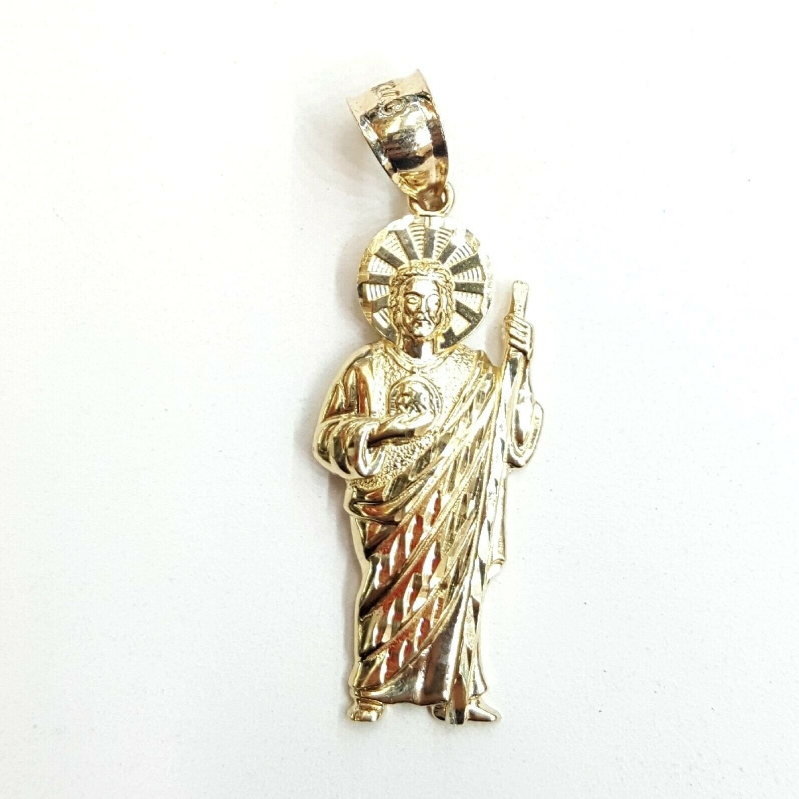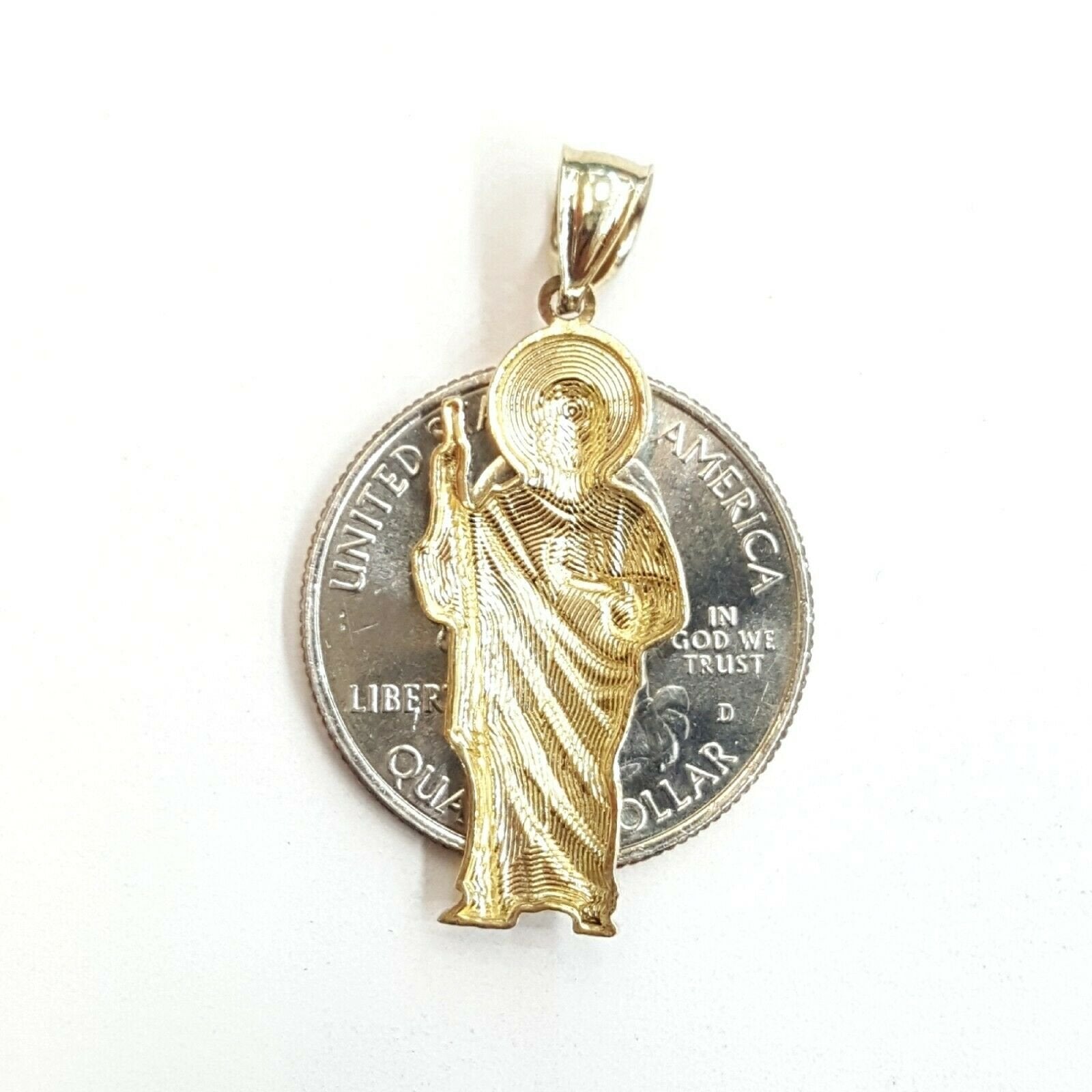 ITEM DESCRIPTION: Beautiful New 10k yellow gold saint Jude juda pendant. Weight: 1.6 grams Metal: 10k genuine gold Left to right: 0.52 inch (widest point). Top to bottom without bail: 1.18 inches. please ask me any questions you may have before you make a purchase. Please refer to the photo of the item next to a quarter for comparison purposes.