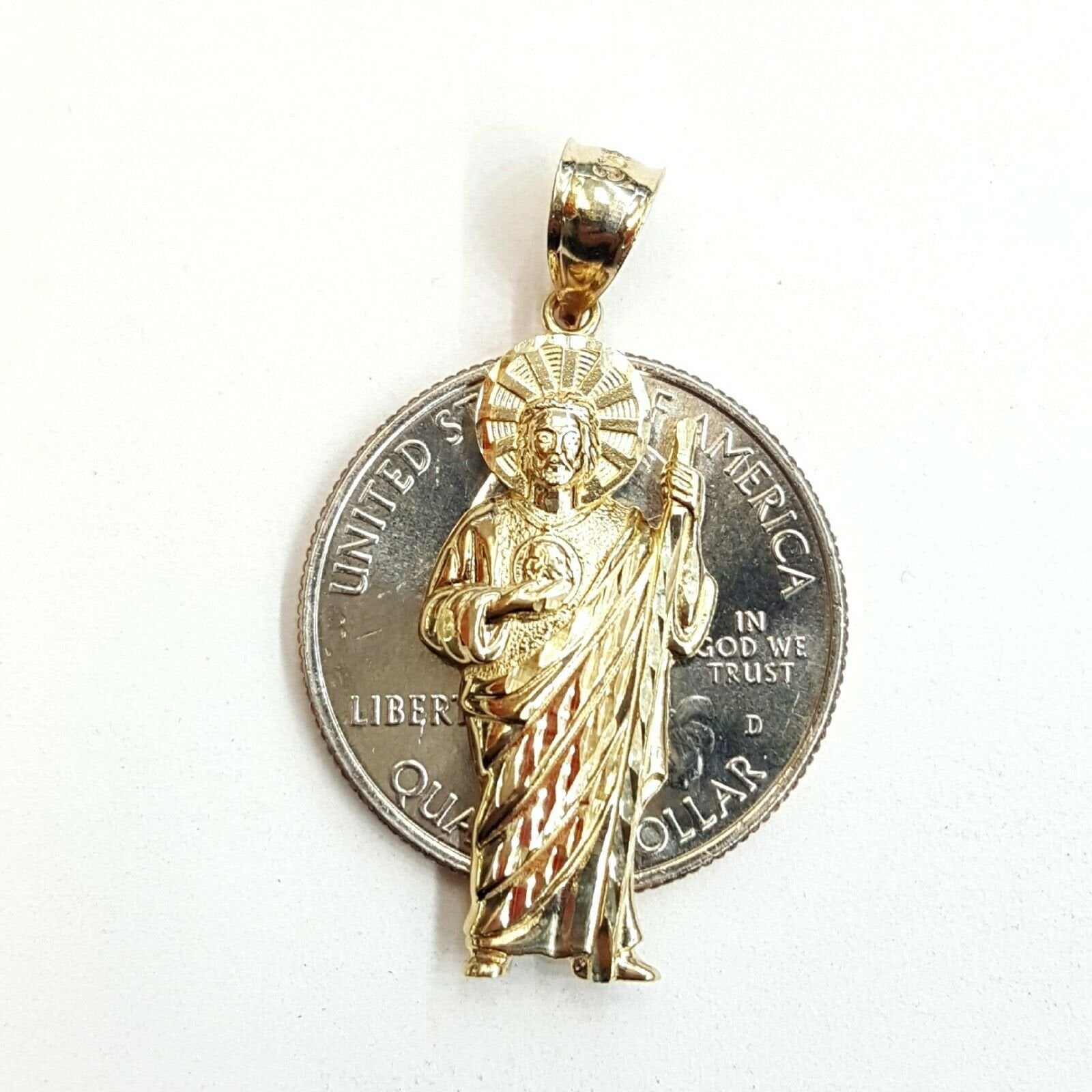 ITEM DESCRIPTION: Beautiful New 10k yellow gold saint Jude juda pendant. Weight: 1.6 grams Metal: 10k genuine gold Left to right: 0.52 inch (widest point). Top to bottom without bail: 1.18 inches. please ask me any questions you may have before you make a purchase. Please refer to the photo of the item next to a quarter for comparison purposes. Shipping: Your order will be professionally packed and shipped. US free shipping is for the 48 Continental states. For shipping to Alaska, Hawaii and Puerto Rico please contact us for a quote. We also offer overnight shipping for the cost of $19.99 which the estimated delivery time is one business day. Return Policy: 30 Day Money Back Guarantee We want your online shopping experience to be risk free. With our hassle-free return policy, if you are not completely satisfied with your purchase, simply ship the item back to us in its original, unused condition (including all original packaging and/or tags) within 14 days for a full refund, less shipping costs. Please email us for a return authorization number prior to shipping the item back. Be sure to add me to your favorites list! Check out my other items! Buy with confidence!