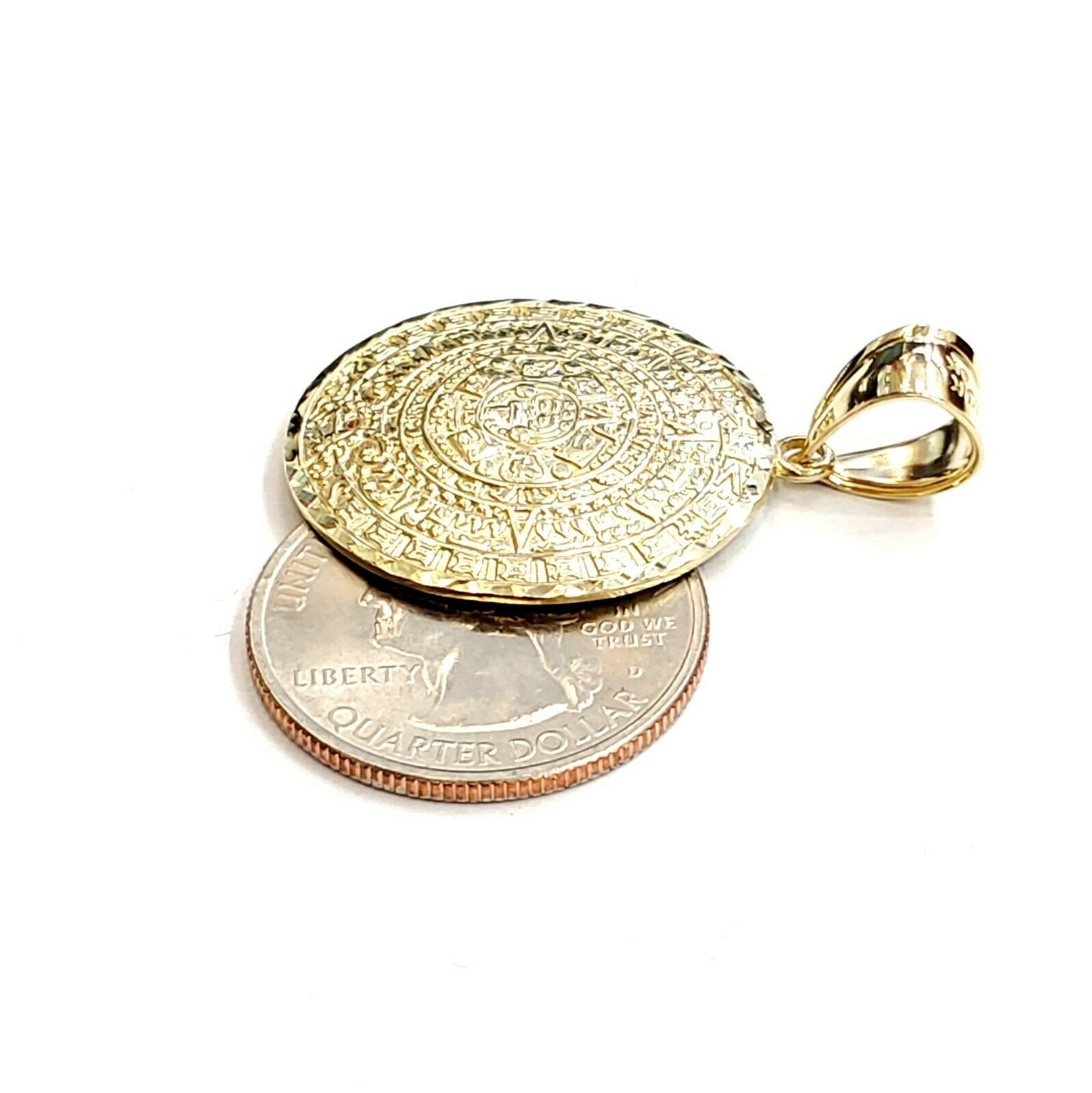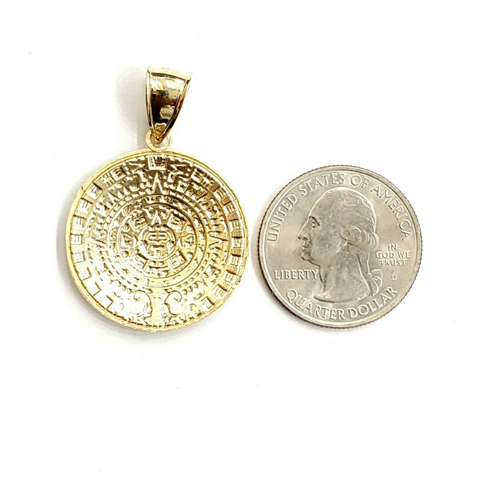 (100% AUTHENTIC)10k yellow gold Aztec Mayan sun calendar pendant charm. "Comes with a gift box"10K yellow Solid Gold pendant charm. Solid 10K gold, not plated. Nicely polished and shiny. Stamped 10K for Authenticity. ADDITIONAL INFO:REAL 10K Yellow Gold.Polished, Shiny5.5 grams.1.06 inches diameter Please refer to the photo of the item next to a quarter for comparison purposes.Shipping:Your order will be professionally packed and shipped. US free shipping is for the 48 Continental states. For shipping to Alaska, Hawaii and Puerto Rico please contact us for a quote. We also offer overnight shipping for the cost of $19.99 which the estimated delivery time is one business day. We will ONLY ship to the shipping address that provides on the payment "Transaction Details" page. To help guard against stolen credit cards and identity theft, NO exceptions will be made.Return Policy: 30 Day Money Back Guarantee We want your online shopping experience to be risk free. With our hassle-free return policy, if you are not completely satisfied with your purchase, simply ship the item back to us in its original, unused condition (including all original packaging and/or tags) within 14 days for a full refund, less shipping costs. Please email us for a return authorization number prior to shipping the item back.Be sure to add me to your favorites list!Check out my other items!Buy with confidence!