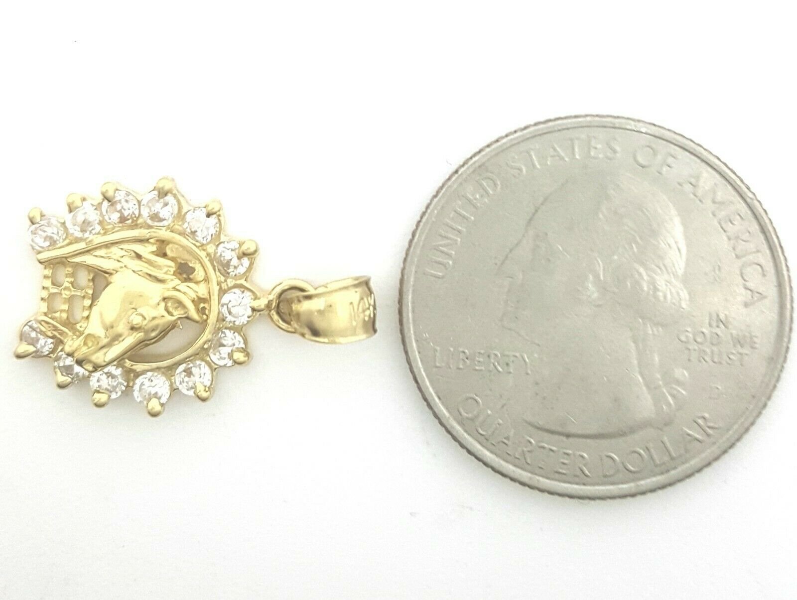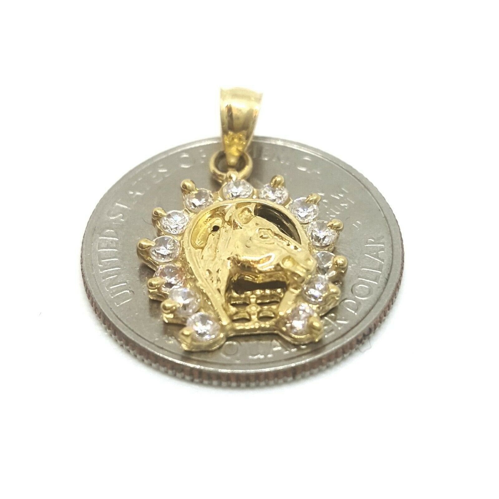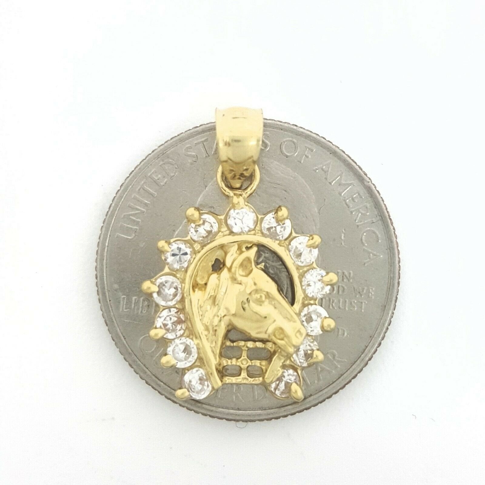 (100% AUTHENTIC) 14k yellow gold horseshoe pendant charm with cubic zirconia. "Comes with a gift box" 14K yellow Solid Gold pendant charm. Solid 14K gold, not plated. Nicely polished and shiny. Stamped 14K for Authenticity. ADDITIONAL INFO: REAL 14K Yellow Gold. Polished, Shiny 2.4 grams. 0.62 inches top to bottom without bail. 0.60 inches left to right. Please refer to the photo of the item next to a quarter for comparison purposes.     Shipping: Your order will be professionally packed and shipped. US free shipping is for the 48 Continental states. For shipping to Alaska, Hawaii and Puerto Rico please contact us for a quote. We also offer overnight shipping for the cost of $19.99 which the estimated delivery time is one business day.   Return Policy: 30 Day Money Back Guarantee We want your online shopping experience to be risk free. With our hassle-free return policy, if you are not completely satisfied with your purchase, simply ship the item back to us in its original, unused condition (including all original packaging and/or tags) within 14 days for a full refund, less shipping costs. Please email us for a return authorization number prior to shipping the item back. Be sure to add me to your favorites list! Check out my other items! Buy with confidence!