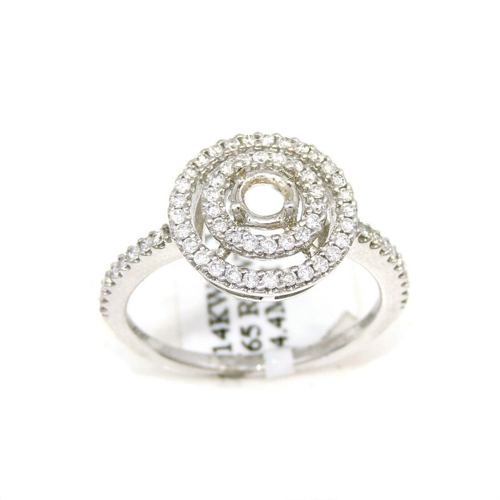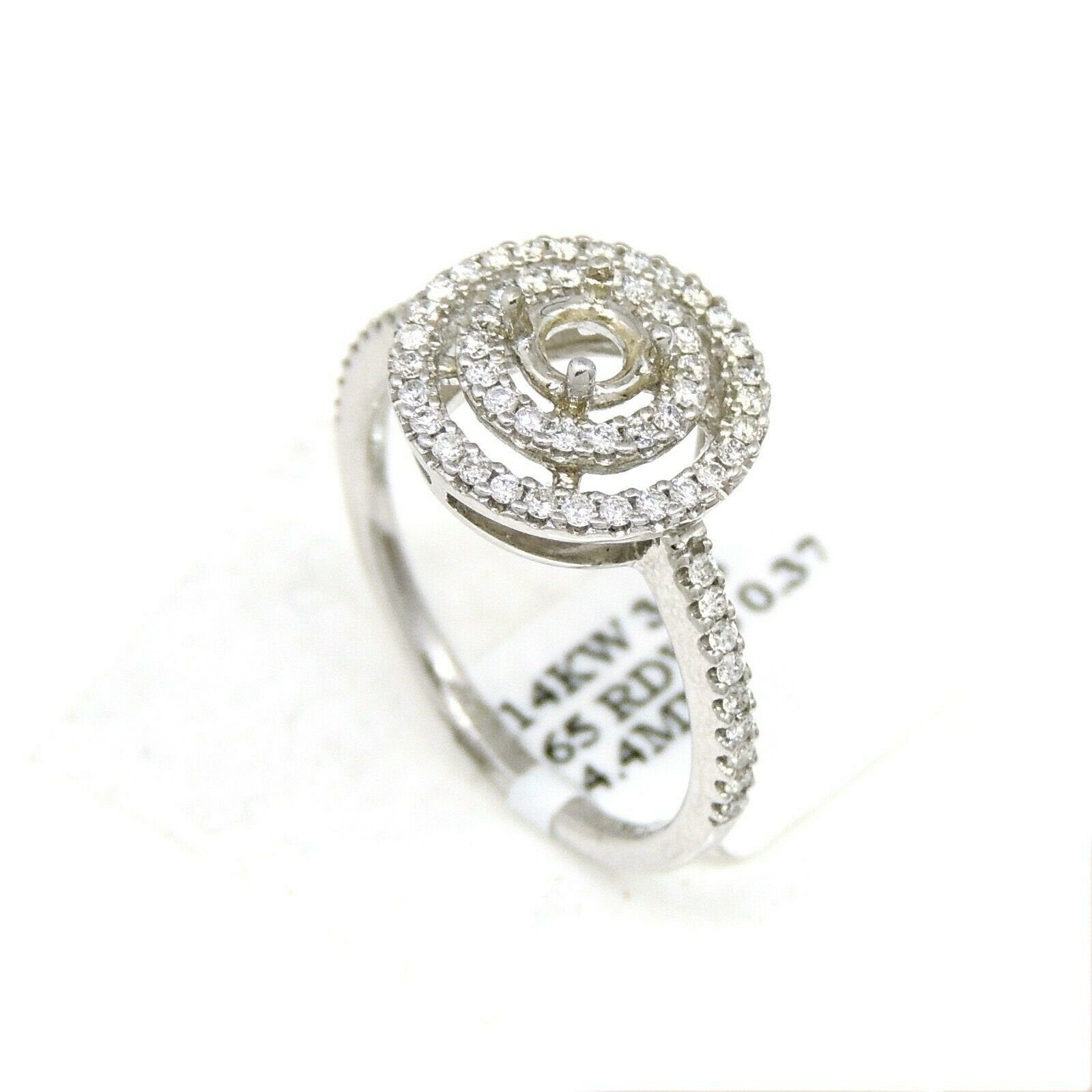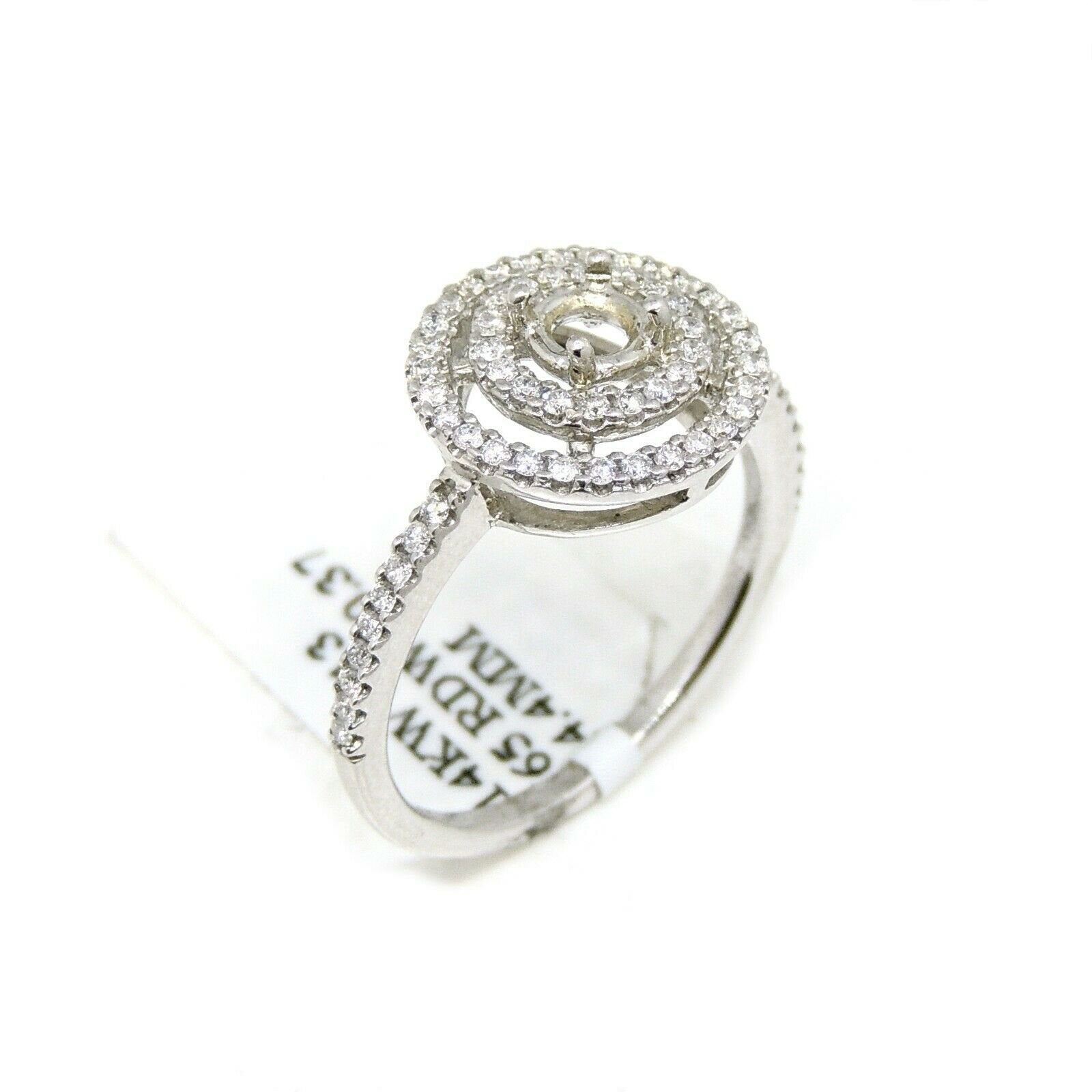 p.p1 {margin: 0.0px 0.0px 8.0px 0.0px; font: 17.0px Helvetica; color: #000000}span.s1 {font-family: 'Helvetica'; font-weight: normal; font-style: normal; font-size: 17.00pt}Item Description:This is a brand new 14k solid white gold double halo diamond semi mount ring with 0.37ct. total weight of round diamond.This ring is size 6.5Ring top size 12mmclarity: SI1-SI2Color:G-HCenter stone shape and size: Round, 4.4mm (not included).It is well made and has a strong structure.This ring weighs 3.1 grams. Please refer to the photo of the item next to a quarter for comparison purposes.Ask me any questions you may have before make a purchase.      Shipping:Your order will be professionally packed and shipped. US free shipping is for the 48 Continental states. For shipping to Alaska, Hawaii and Puerto Rico please contact us for a quote. We also offer overnight shipping for the cost of $19.99 which the estimated delivery time is one business day. Return Policy: 30 Day Money Back Guarantee We want your online shopping experience to be risk free. With our hassle-free return policy, if you are not completely satisfied with your purchase, simply ship the item back to us in its original, unused condition (including all original packaging and/or tags) within 14 days for a full refund, less shipping costs. Please email us for a return authorization number prior to shipping the item back.Be sure to add me to your favorites list!Check out my other items!Buy with confidence!