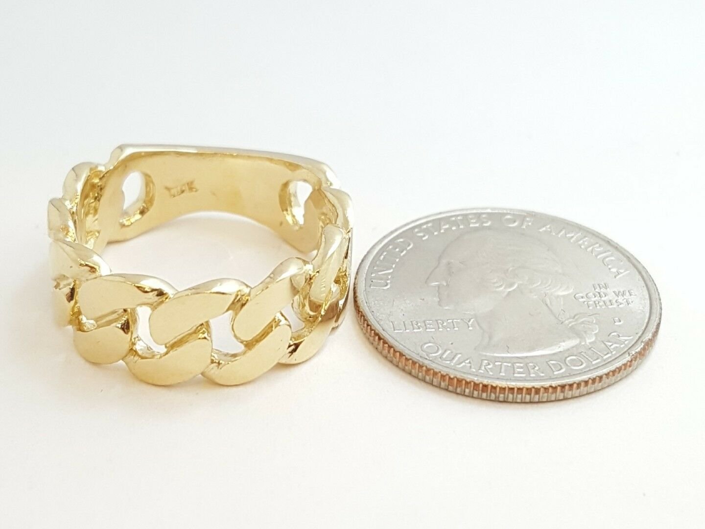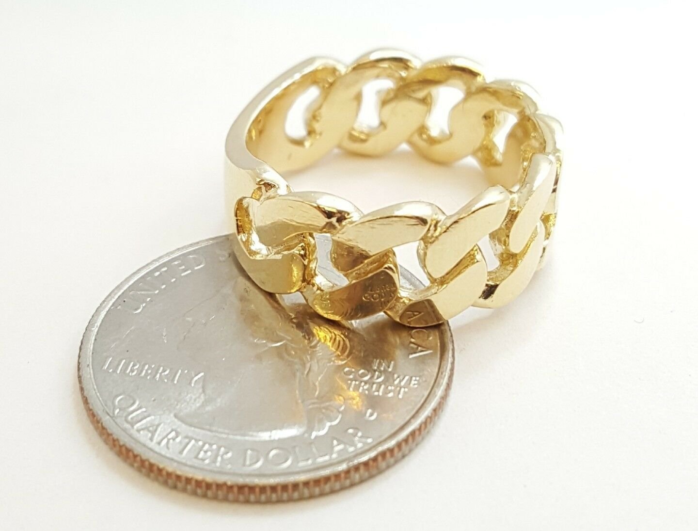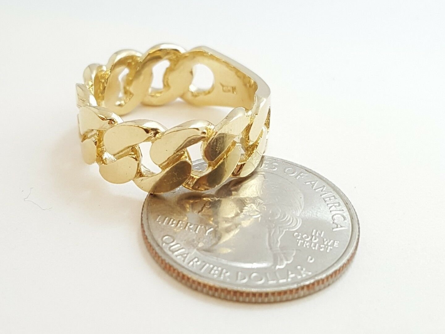 14K Yellow Solid Gold cuban link Band Ring 9mm Size 9 Solid gold band, not hollow. Solid 14K gold, not plated. Nicely polished and shiny. Stamped 14K for Authenticity. Weight - 10.1 Grams.