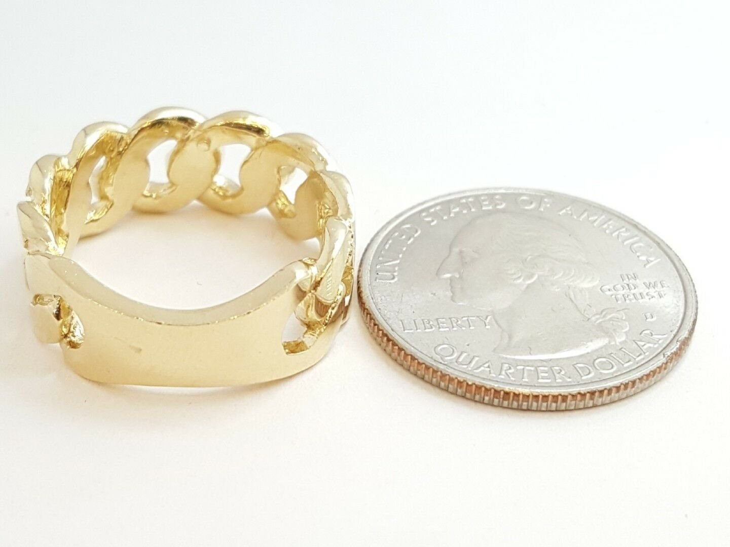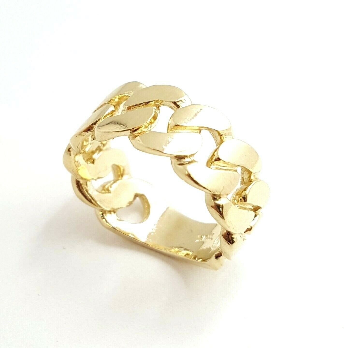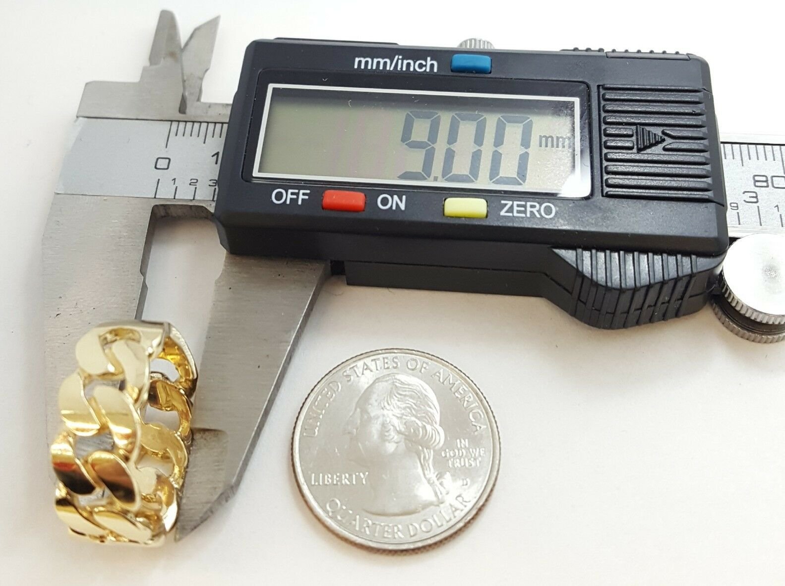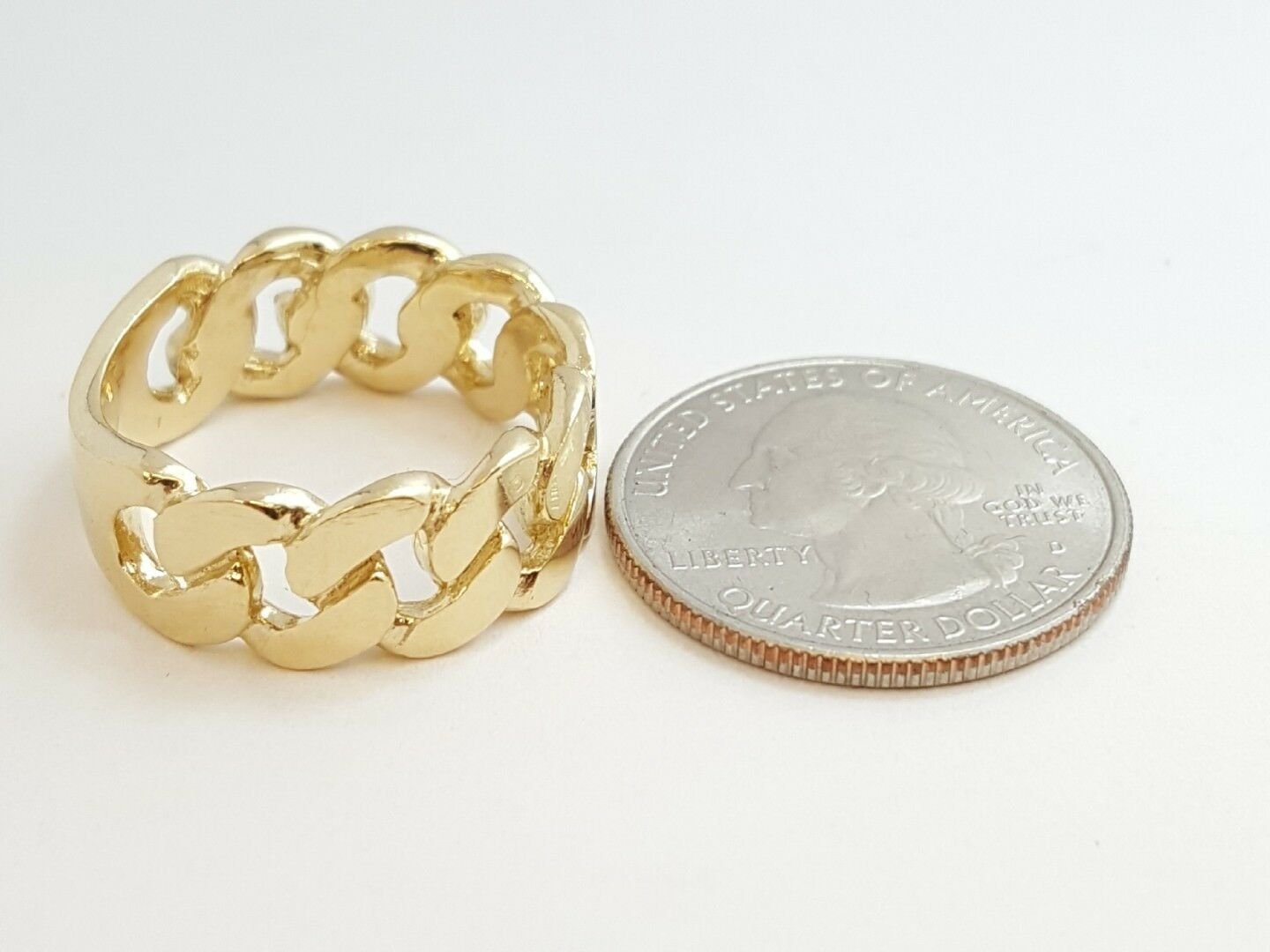 14K Yellow Solid Gold cuban link Band Ring 9mm Size 9 Solid gold band, not hollow. Solid 14K gold, not plated. Nicely polished and shiny. Stamped 14K for Authenticity. Weight - 10.1 Grams.